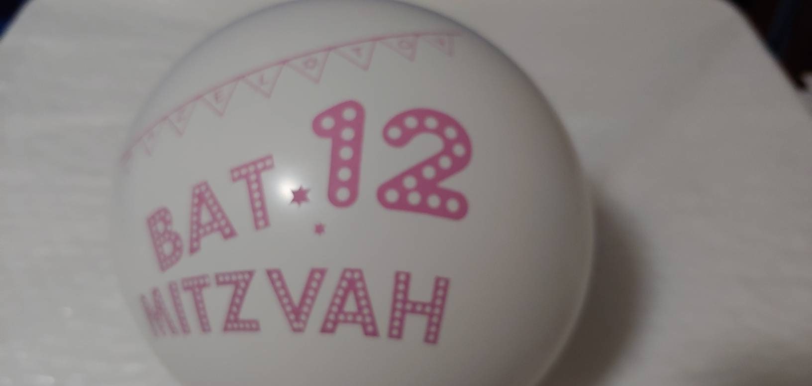 SET OF 5 LATEX BALLOONS -- Bat - 12 - Mitzvah Printed on balloons. Also has Mazel Tov spelled out in the small banner.
